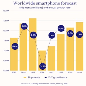Worldwide smartphone shipments are forecast to decline 12.9% year-on-year (YoY) in 2026 to 1.1 billion units, according to the International Data Corporation (IDC) Worldwide Quarterly Mobile Phone Tracker. This decline will bring the smartphone market to its lowest annual shipment volume in more than a decade. The current forecast represents a sharp decline from our November forecast amid the intensifying memory shortage crisis.