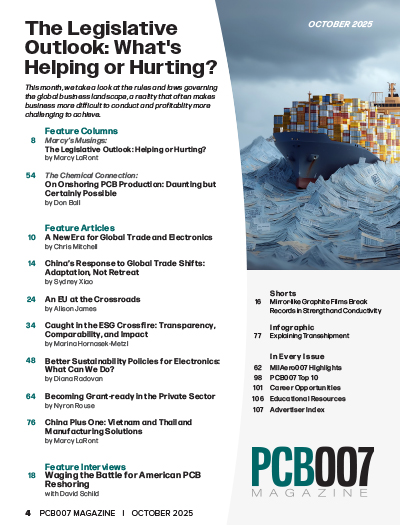 In this issue of PCB007 Magazine, we talk with leading economic experts, advocacy specialists in Washington, D.C., and PCB company leadership to get a well-rounded picture of what’s happening in the industry today. Don’t miss it.